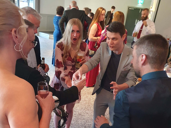 Typically a 45-minute stage performance that brings everything together in one seamless act. With his own optional sound setup, Dustin ensures a stress-free experience for organisers and a polished performance for guests. Combining magic, comedy and visual theatre, Dustin delivers a high-energy show that is ideal for standalone events, weddings and milestone parties. This act is designed to be as effortless to host as it is unforgettable to watch.
